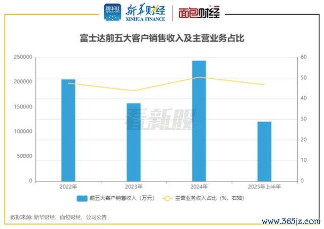 值得注意的是,富士达的产品销售以境外销售为主,境外收入在主营业务中占比超过七成。此外,公司的客户集中度较高,2025年上半年度,前五大客户销售收入合计占当期主营业务收入的比例超过46%。