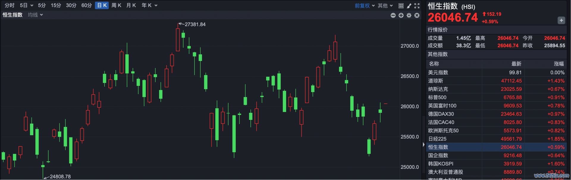 截至发稿,恒生指数报26046.74点,上涨152.19点,涨幅0.59%。