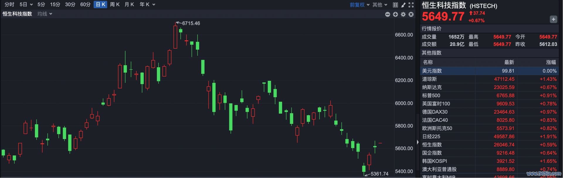恒生科技指数报5649.77点,上涨37.74点,涨幅0.67%。