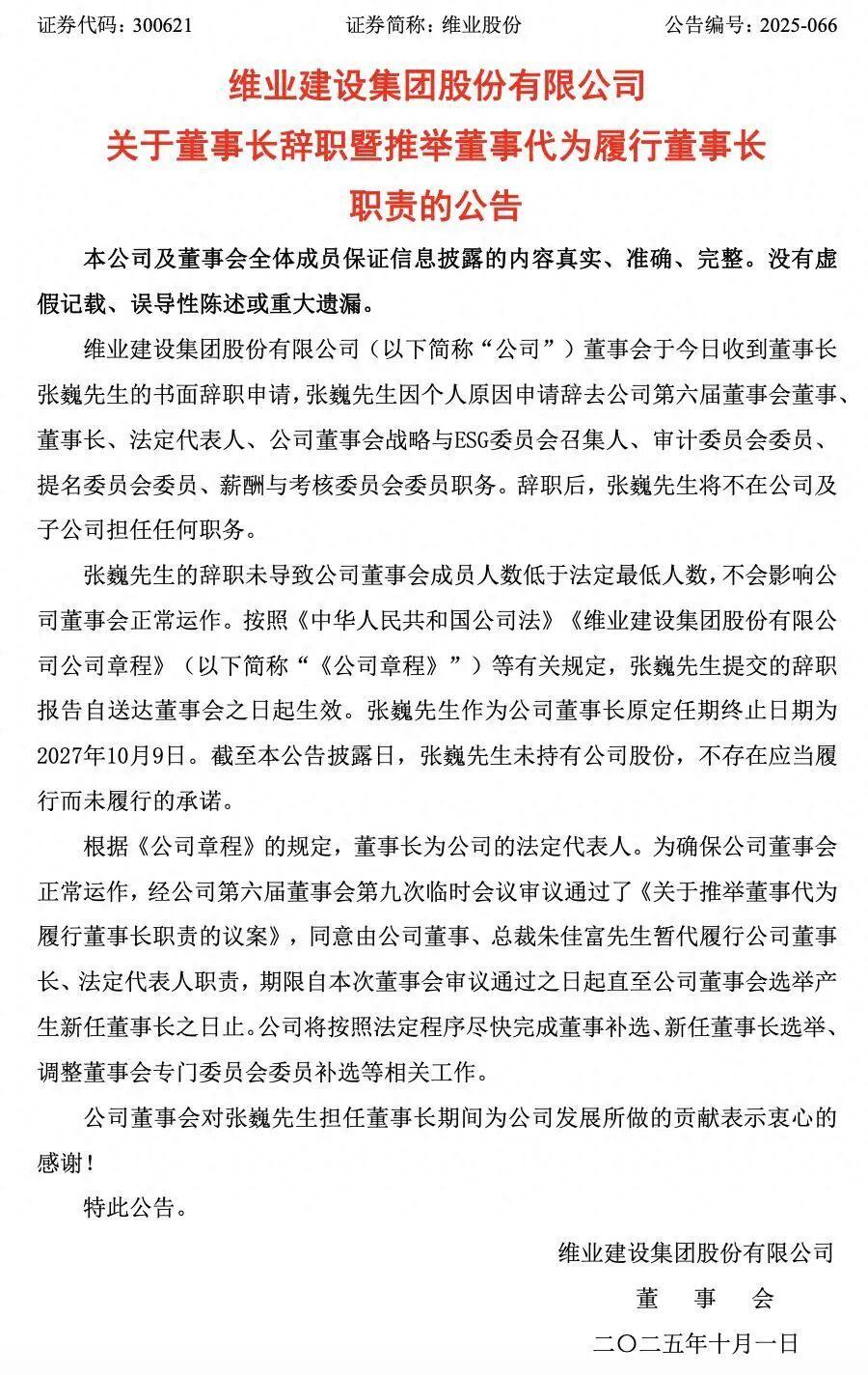 依据维业股份公布的公告,张巍此次辞职堪称“全身而退”。他不仅卸任了董事长、董事、法定代表人这三项核心职务,还一并辞去了公司董事会下设的战略与ESG委员会、审计委员会、提名委员会、薪酬与考核委员会的所有职务。