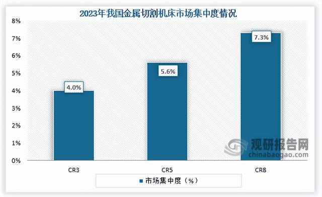 从市场集中情况来看,我国金属切割机床市场集中度低,企业竞争激烈,在2023年市场CR3、CR5、CR8市场份额占比分别为4.0%、5.6%、7.3%。