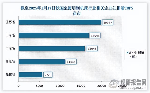 我国金属切削机床参与企业较多,根据企查查数据显示,截至2025年1月17日我国金属切削机床行业相关企业注册量我119288家,其中相关注册量前五的省市分别为江苏省、山东省、广东省、浙江省、福建省;企业注册量分别为19947家、16948家、15946家、11134家、5728家;占比分别为16.72%、14.21%、13.37%、9.33%、4.80%。