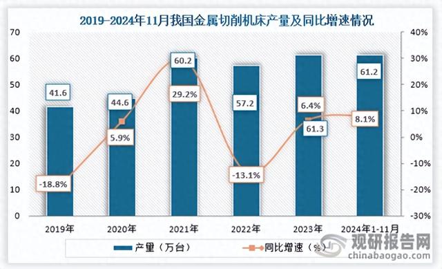 金属切削机床是工业领域不可或缺的设备之一,可以提高加工效率和产品质量,广泛应用于汽车、航空航天、模具、工程机械、国防、电子等领域。而随着工业的发展,金属切削机床在在生产过程中的重要性越来越受到重视。从产量来看,2019年到2023年我国金属切削机床产量从41.6万台增长到了61.3万台,到2024年1-11月我国金属切削机床产量为61.2万台,同比增长8.1%。